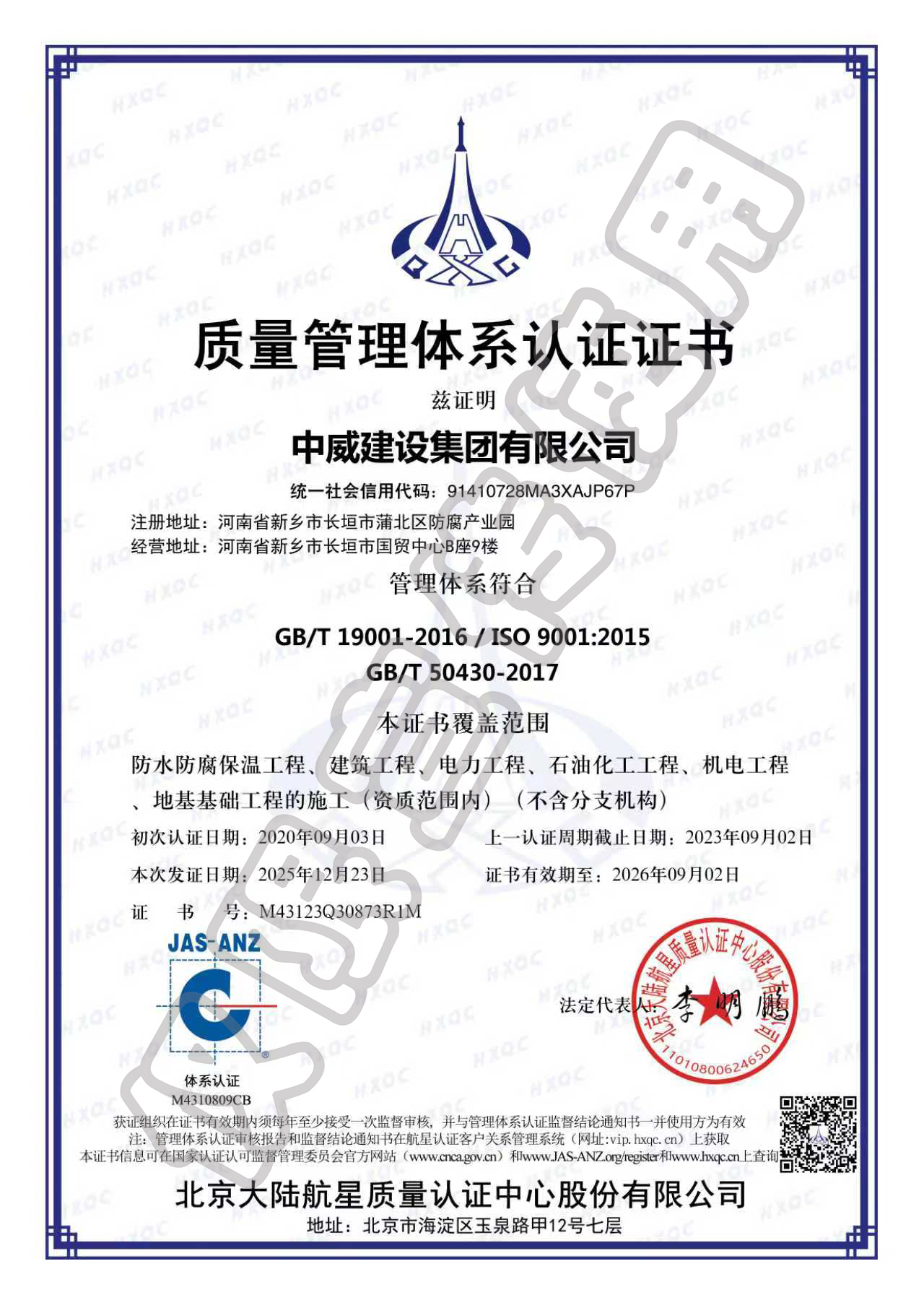 质量管理体系认证证书